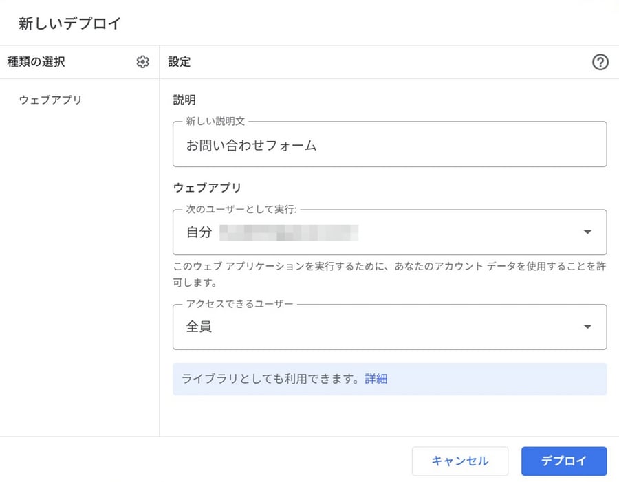 スクリプトを「ウェブアプリ」としてデプロイ(公開)します。