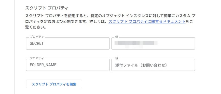シグネチャ検証用のシークレットと、添付ファイルの保存先フォルダ名を「スクリプト プロパティ」に追加します。