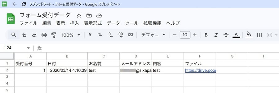 最後に、フォームのテスト送信をします。フォームが送信され、スクリプトが正常に実行されると、スプレッドシートに受付データが自動で反映されます。