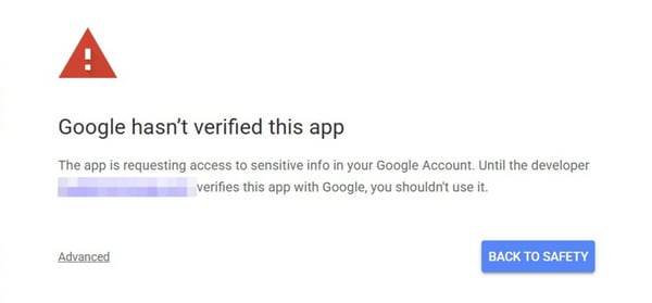 - 「Google hasn't verified this app」画面左下の [Advanced] > [Go to...(unsafe)] をクリックします。(※この画面が表示されない場合は、次のステップに進んでください)