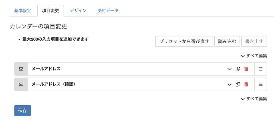 - 「フォームの項目変更」画面で「メールアドレス」項目が 2 つになるよう追加する