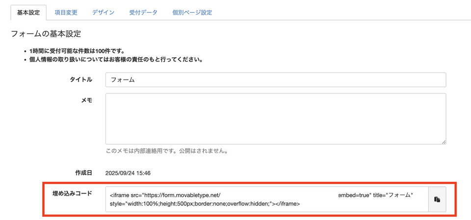 - 「基本設定」タブから埋め込みコードをコピーし、フォームを公開したいページに貼り付ける
