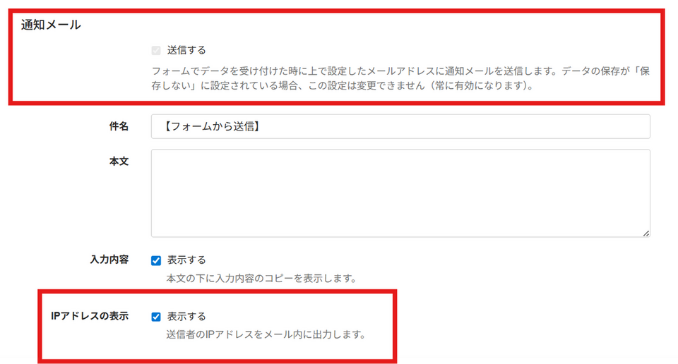 フォームを利用して送信したユーザーの情報を知りたい場合、「通知メール」にて IPアドレス の取得が可能です。設定は各フォームの基本設定から行います。