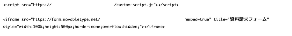 必ずフォームを設置しているページ内(iframe のソースを貼っているページ)に script を埋め込みます。script は、フォームの「埋め込みコード」より上に設置してください。