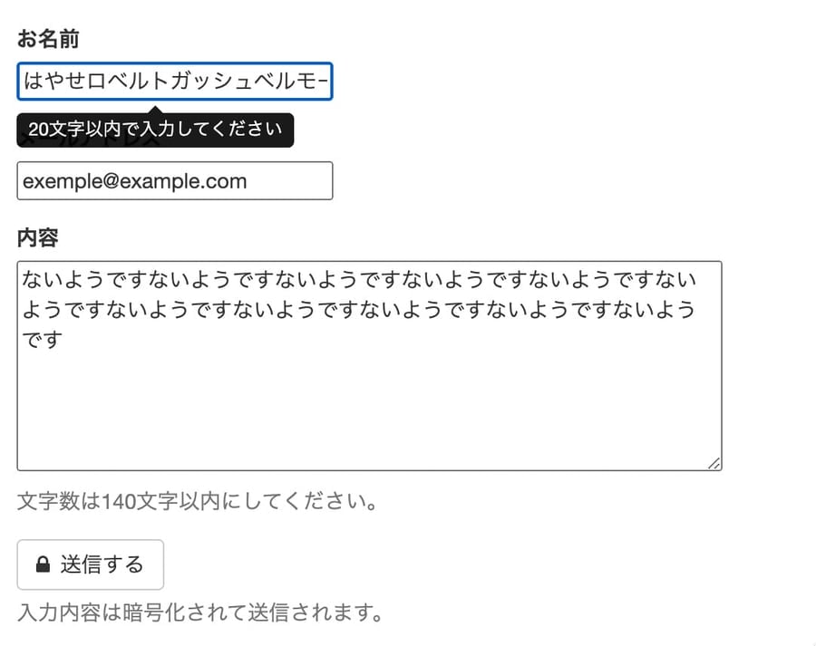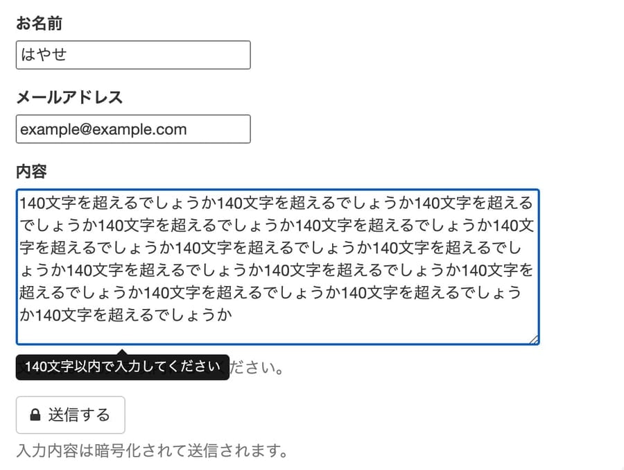 今回はお名前、メールアドレス、内容の3つのフォームの項目のうち、内容について140文字で制限をします。