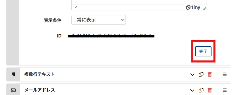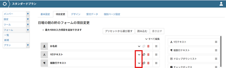 - 該当するフォームの名前をクリックし [項目変更] タブを開く