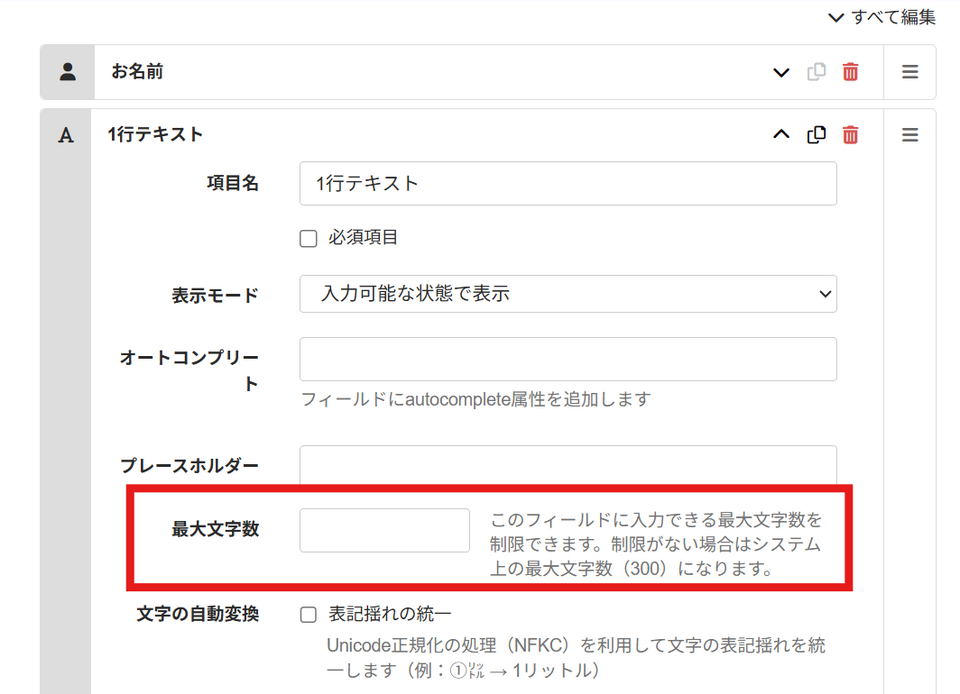フォーム機能では、「一行テキスト」と「複数行テキスト」項目についてはそれぞれの項目の編集画面「最大文字数」にて設定が可能です。具体的な手順は以下になります。