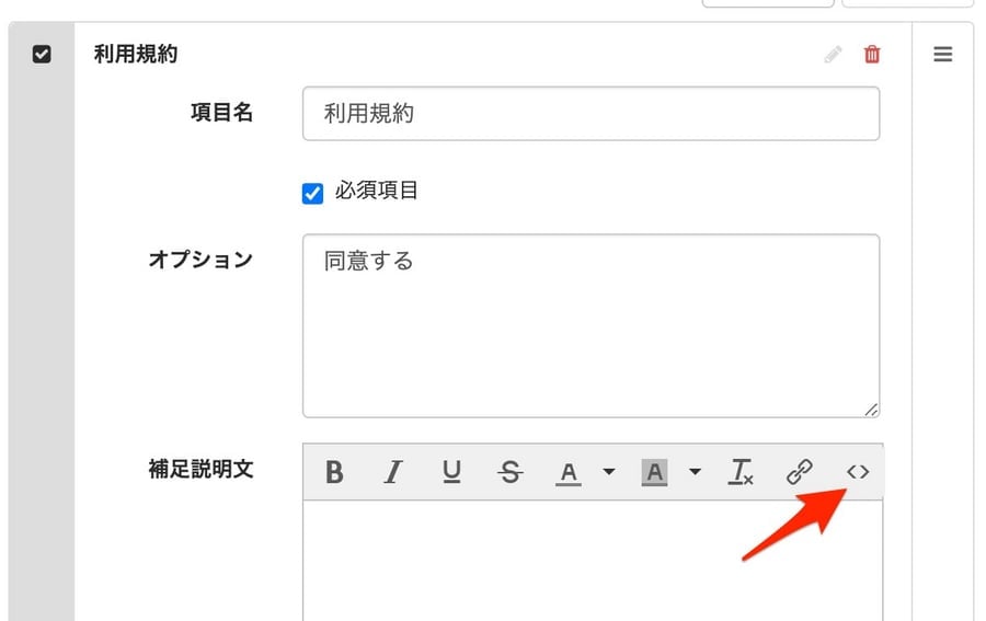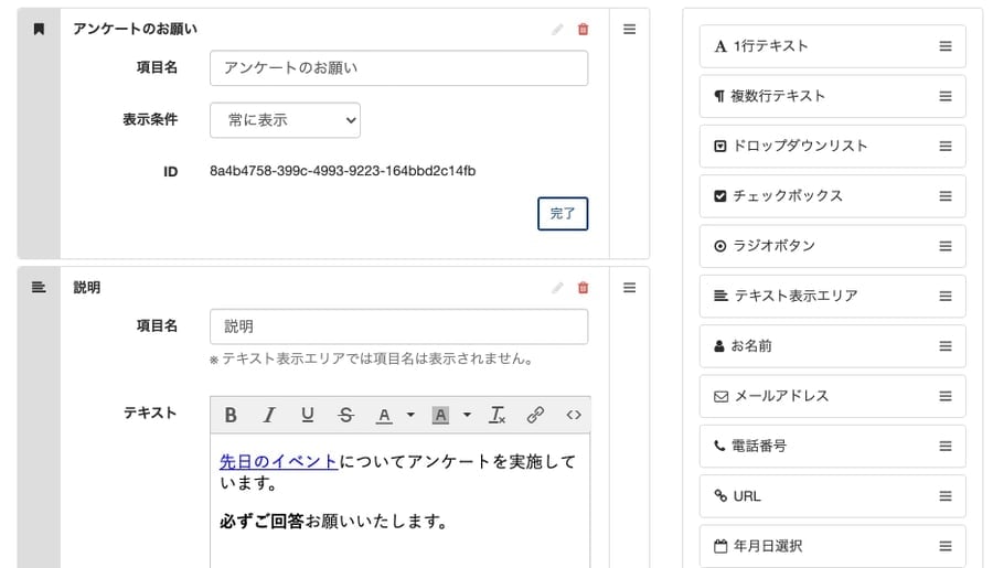 フォームの項目「テキスト表示エリア」のテキスト部分と各項目の「補足説明文」部分では、装飾ボタンが利用できます。
