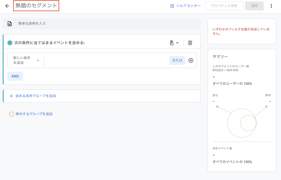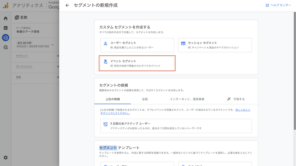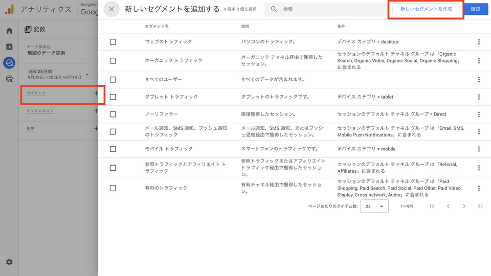 遷移したページの [変数] > [セグメント] の右側の+マークをクリックし、右上の「新しいセグメントを作成」をクリックする