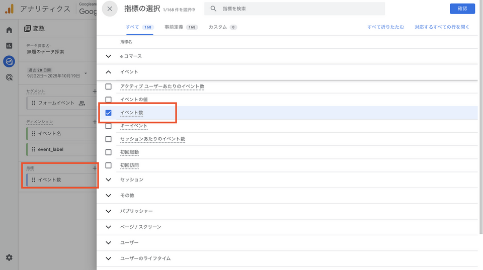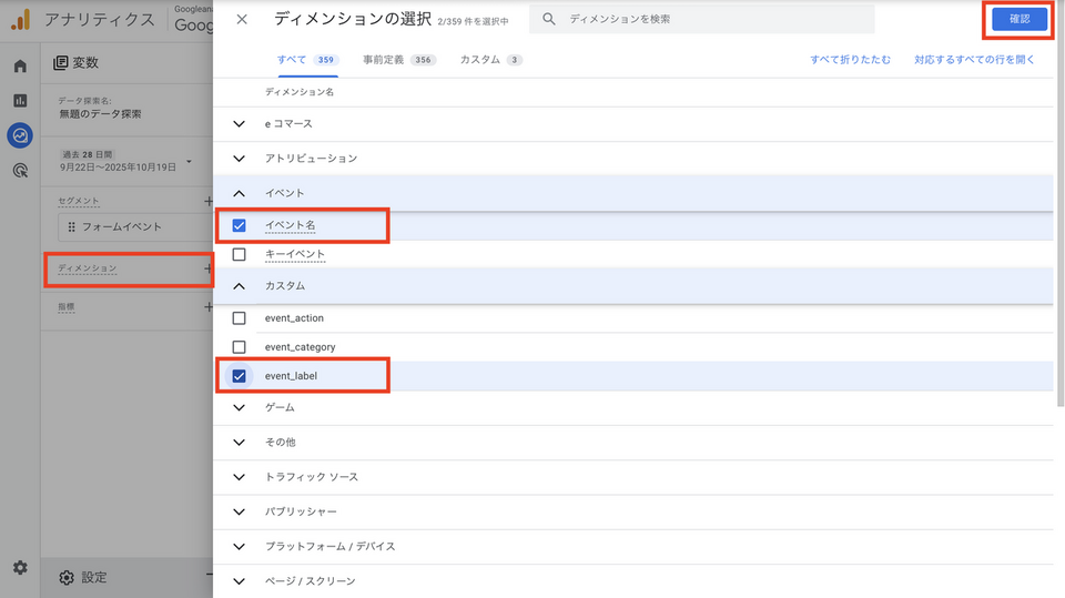 [変数] 内にある [ディメンション] の右側の+マークをクリックして、[イベント] > [イベント名] と [カスタム] > [event_label] の2つを選択し、右上の「確認」ボタンをクリックする
