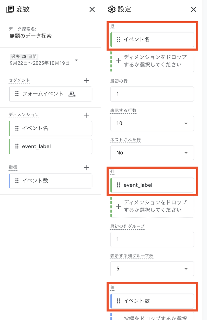 [変数] > [設定] より、行・列・値に次の内容を選択する