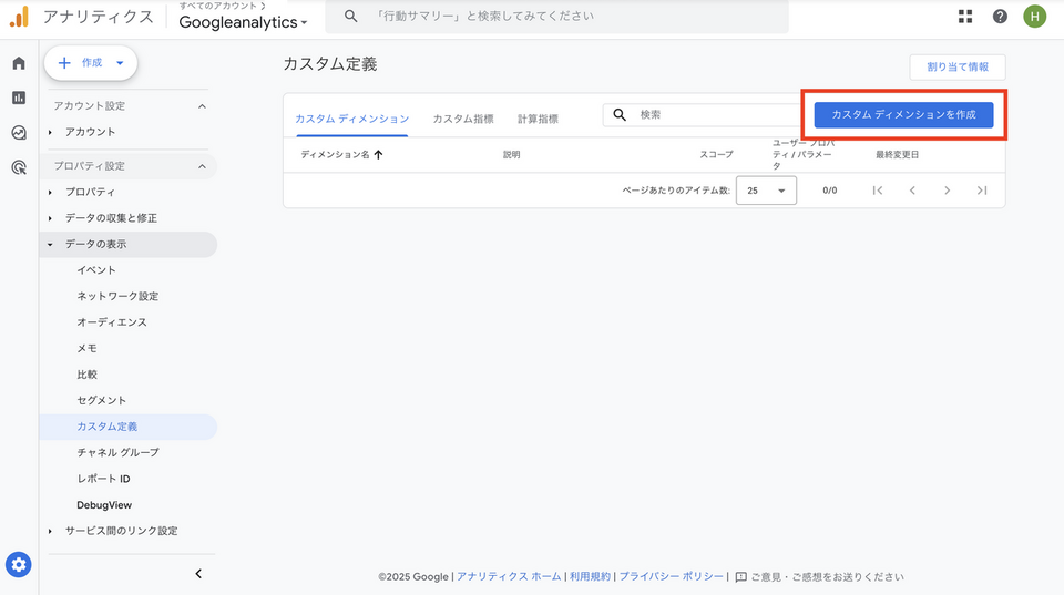 Google アナリティクスの、左メニューの [管理] > [プロパティ設定] > [データの表示] > [カスタム定義] から「カスタムディメンションを作成」をクリックする