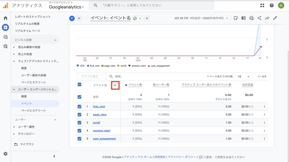左メニューから [レポート] > [ユーザー エンゲージメントとユーザー維持率の把握] > [イベント] から「イベント名」の右の+マークをクリックする