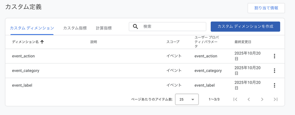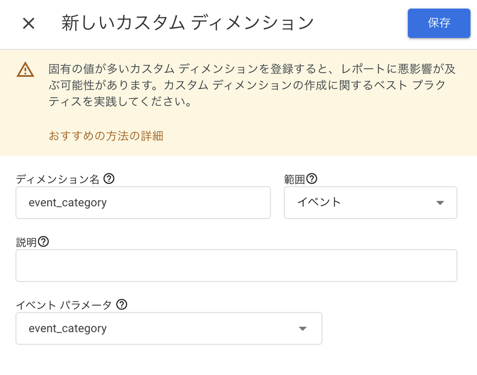 「ディメンション名」と「イベント パラメーター」は、フォームで利用している「event_category」、「範囲」は「イベント」を設定し「保存」ボタンをクリックする