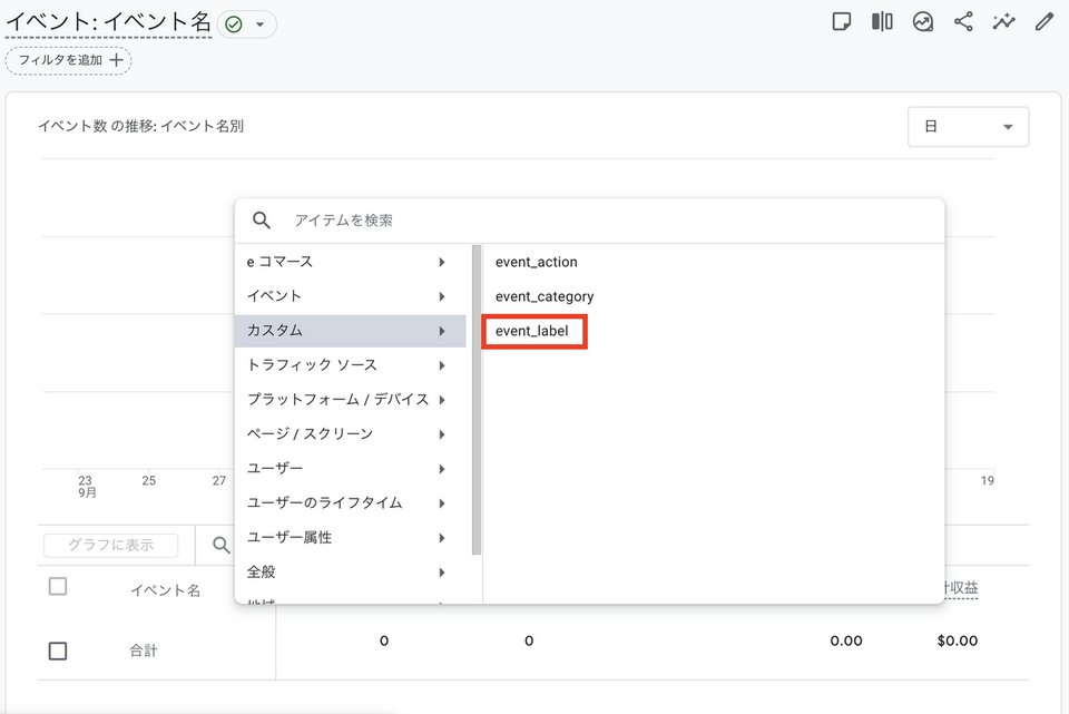 不要なデータを非表示にするため、 [設定] > [フィルタ] から、「event_label」を選択し、[条件] の [マッチタイプを選択してください] > [含まない] 、[式を入力] > [(not set)] を指定し、適用する