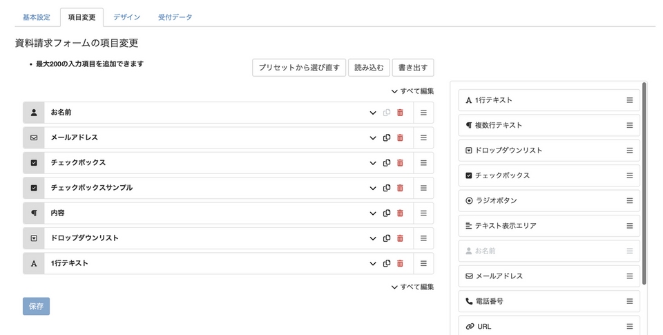 フォームの作成後、項目を編集するには以下の手順を行います。
