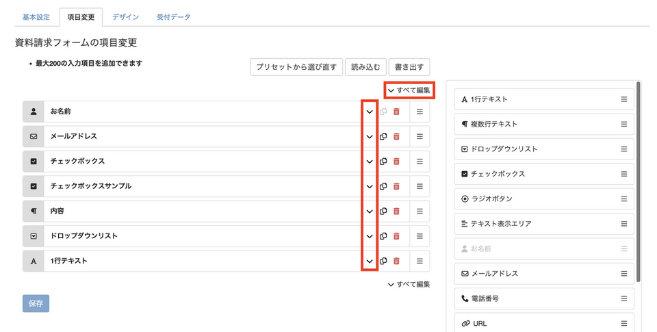 全項目を編集する場合「すべて編集」をクリックしてください。 - 項目名など必要な項目を編集する