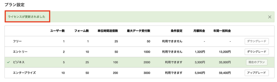 画面上部に「ライセンスが更新されました」というメッセージが表示される