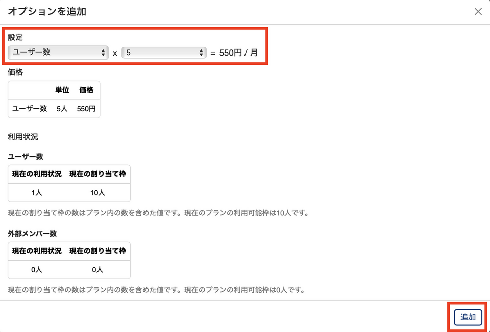 - 購入したい機能と個数を選択し、「追加」ボタンをクリックする