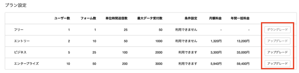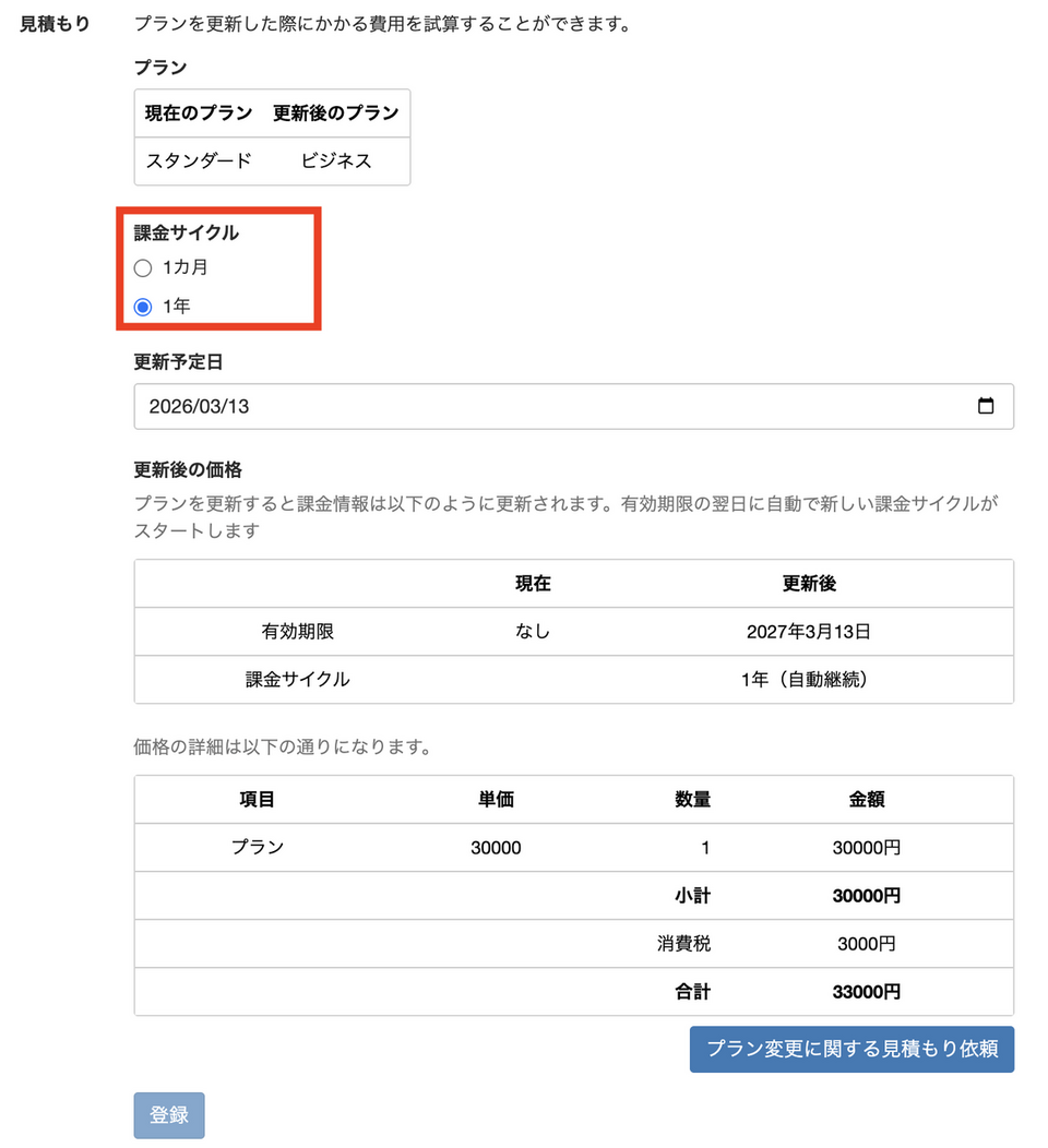プランをアップグレードされた場合、プラン変更に伴う差額が有効期限までの日割り費用で請求されます。