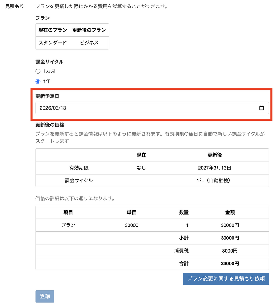 - 「更新予定日」でアップグレード、もしくは、ダウングレードを実施したい日を選択する