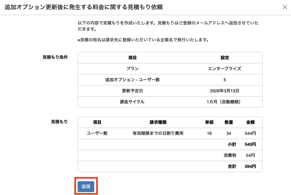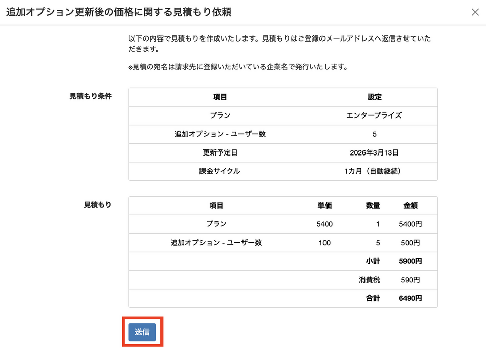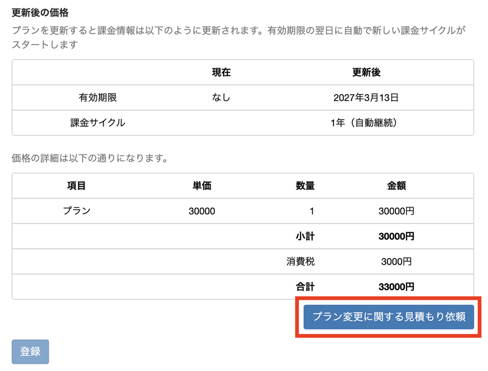 - 確認した内容と金額で見積書の発行を希望する場合は「プラン変更に関する見積もり依頼」ボタンをクリックする