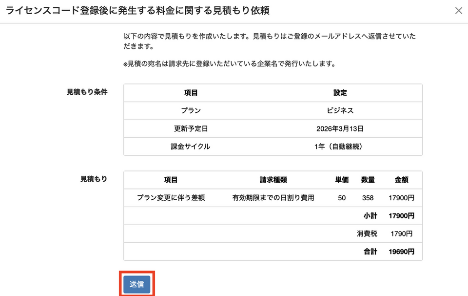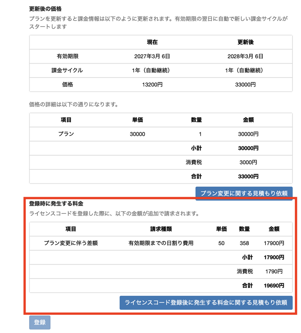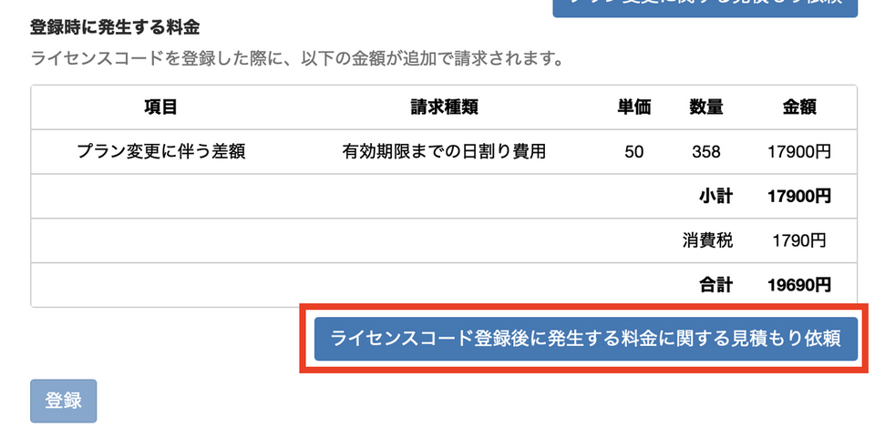 - 見積書の発行を希望する場合は「ライセンスコード登録後に発生する料金に関する見積もり依頼」ボタンをクリックする