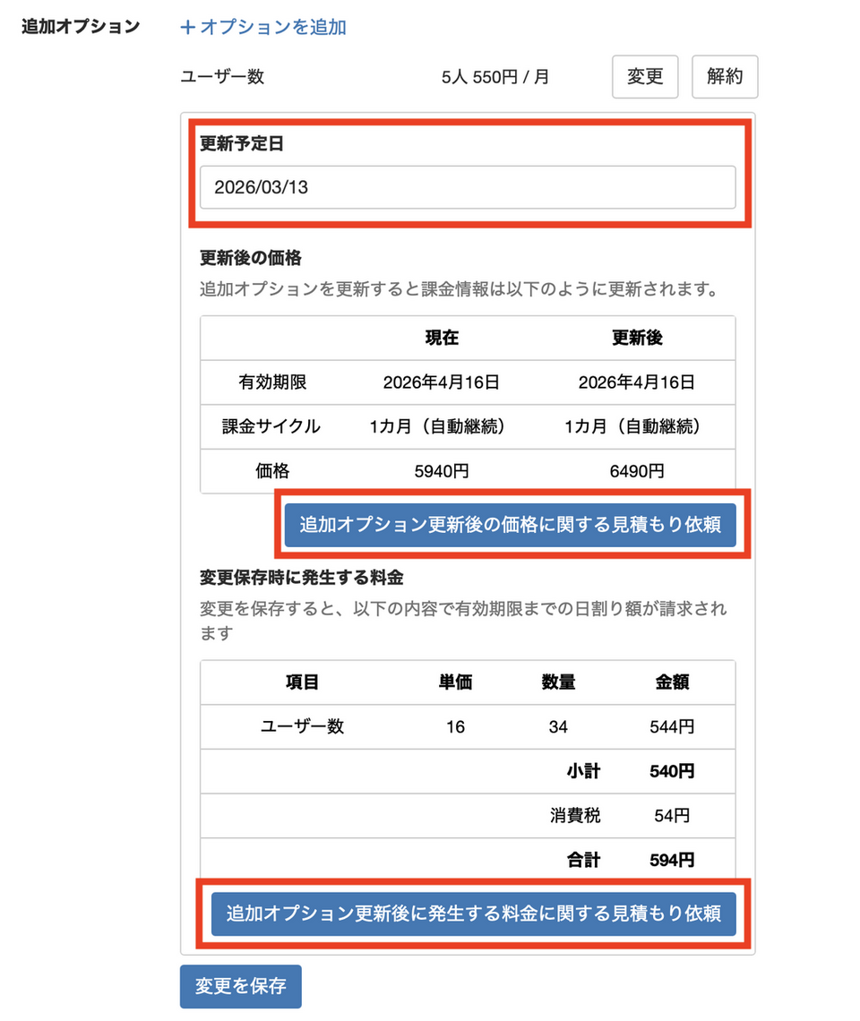- オプション購入を予定している日を「更新予定日」から選択し、「追加オプション更新後の価格に関する見積もり依頼」、「追加オプション更新後に発生する料金に関する見積もり依頼」ボタンをクリックする