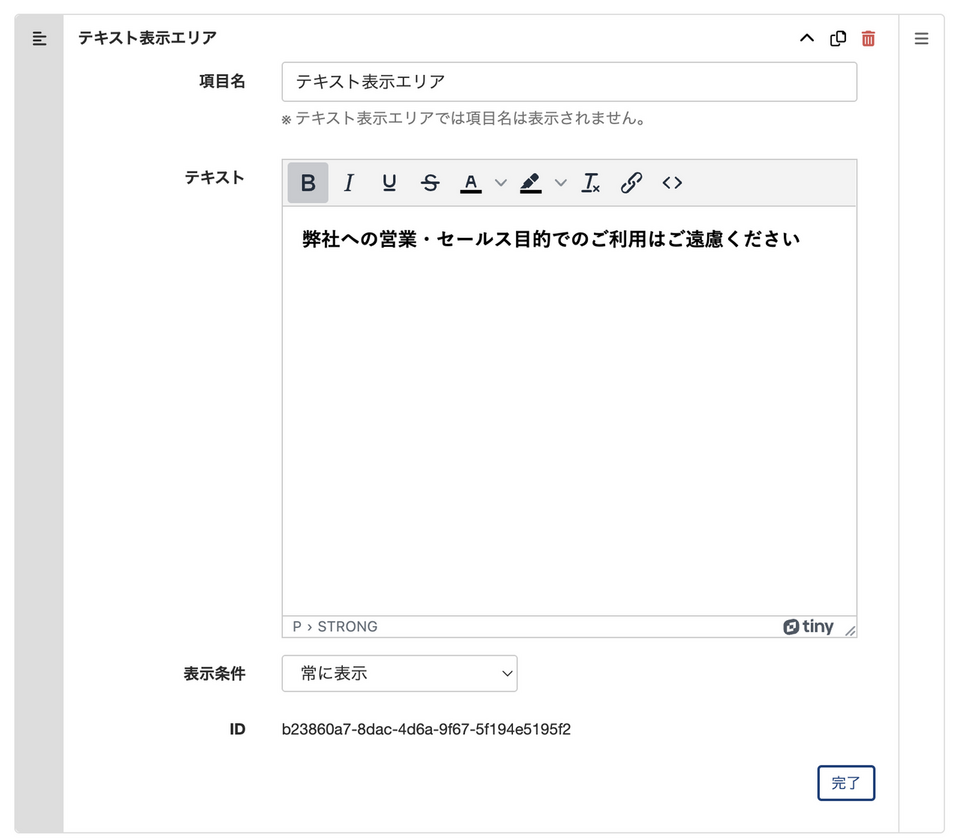 - テキスト:「弊社への営業・セールス目的でのご利用はご遠慮ください」等任意の文章