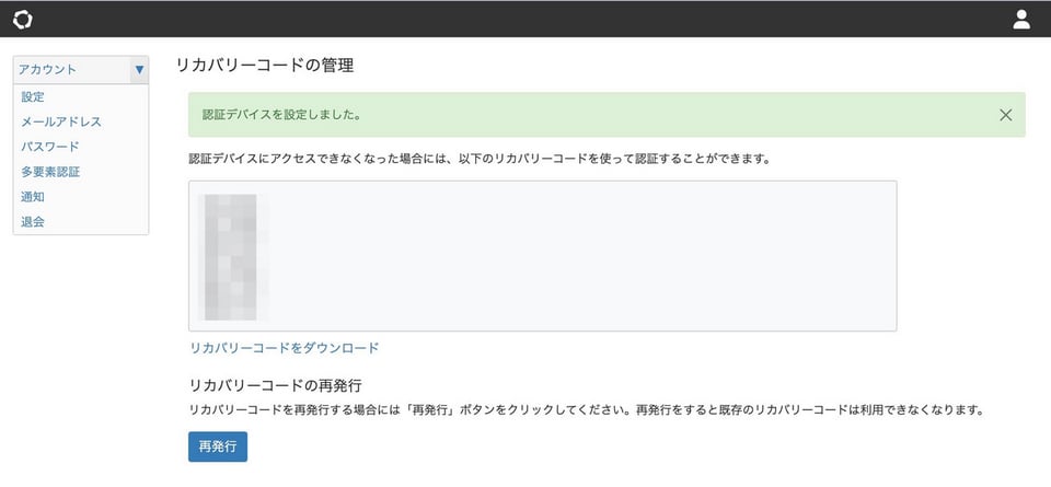 - 認証コード登録後に表示される「リカバリーコードの管理」画面の「リカバリーコードをダウンロード」リンクをクリックし、リカバリーコードをダウンロードする