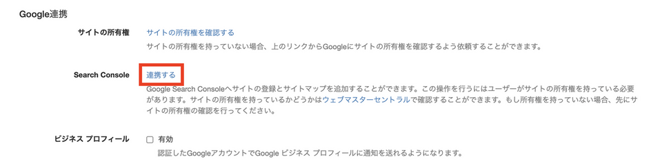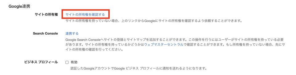 - 「Google連携」>「サイト所有権」項目の「サイトの所有権を確認する」リンクをクリックする
