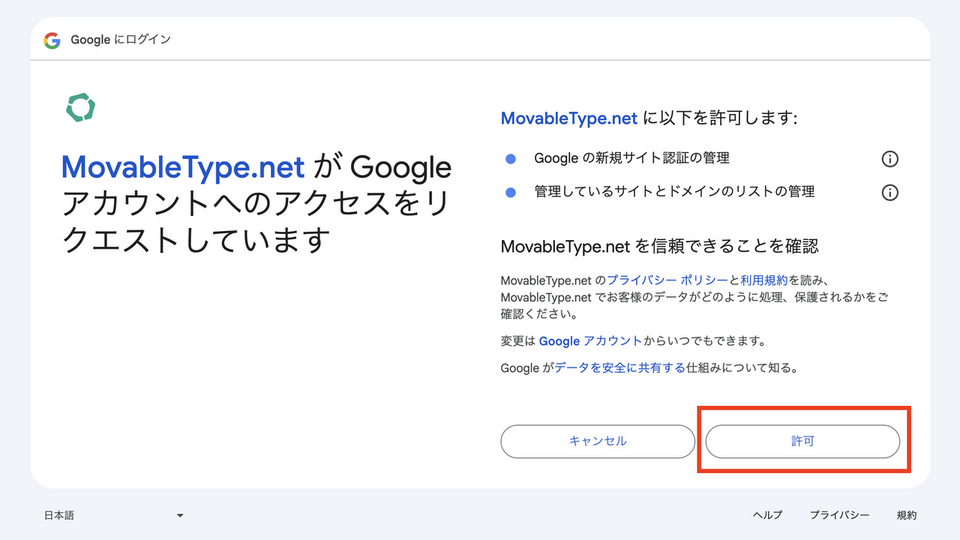 - 確認ページで「許可」を選択し、アクセスを許可する