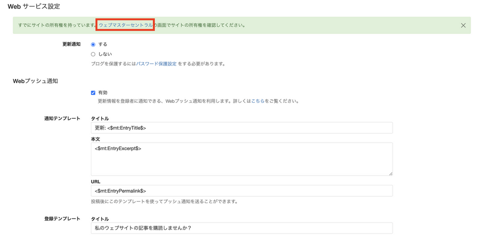 - 管理画面に移動するので、表示された「ウェブマスターセントラル」リンクをクリックする