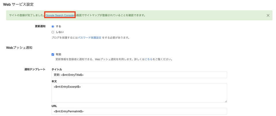 - サイトの登録が完了し Search Console へ sitemap.xml の登録が行われます。(MovableType.net ではウェブサイトとブログの直下に sitemap.xml ファイルが自動的に生成されるようになっています。)
