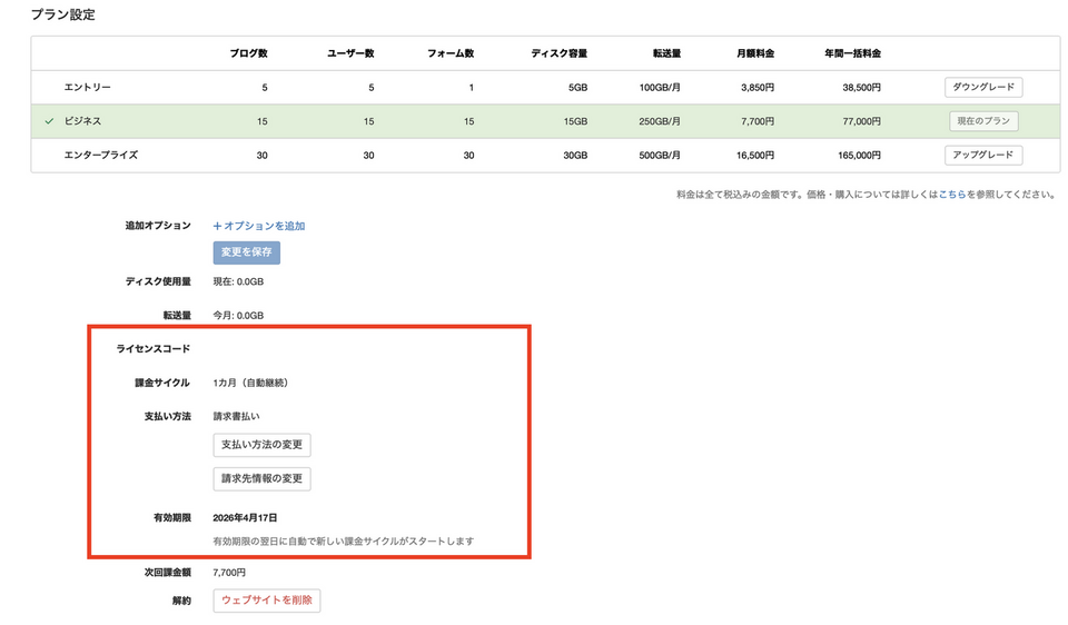 プランを変更する場合は、変更後のプランのライセンスを購入して、「アップグレード」または「ダウングレード」ボタンをクリックしてライセンスコードを登録してください。