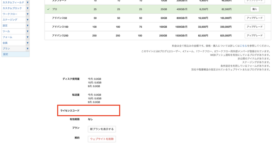 ライセンスコードを確認する ライセンスコードの確認方法 ダッシュボードに表示されるウェブサイトとブログ一覧から、ウェブサイト名をクリックする 左サイドバーの [プラン] - [設定] をクリックする 「プラン」の項目はアクセス権限が「オーナー」の場合に表示されます 管理画面の下部に「ライセンスコード」が表示される