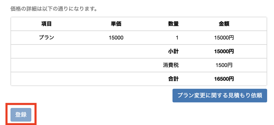 - ご希望のプランの「アップグレード」ボタン、「ダウングレード」ボタンをクリックする