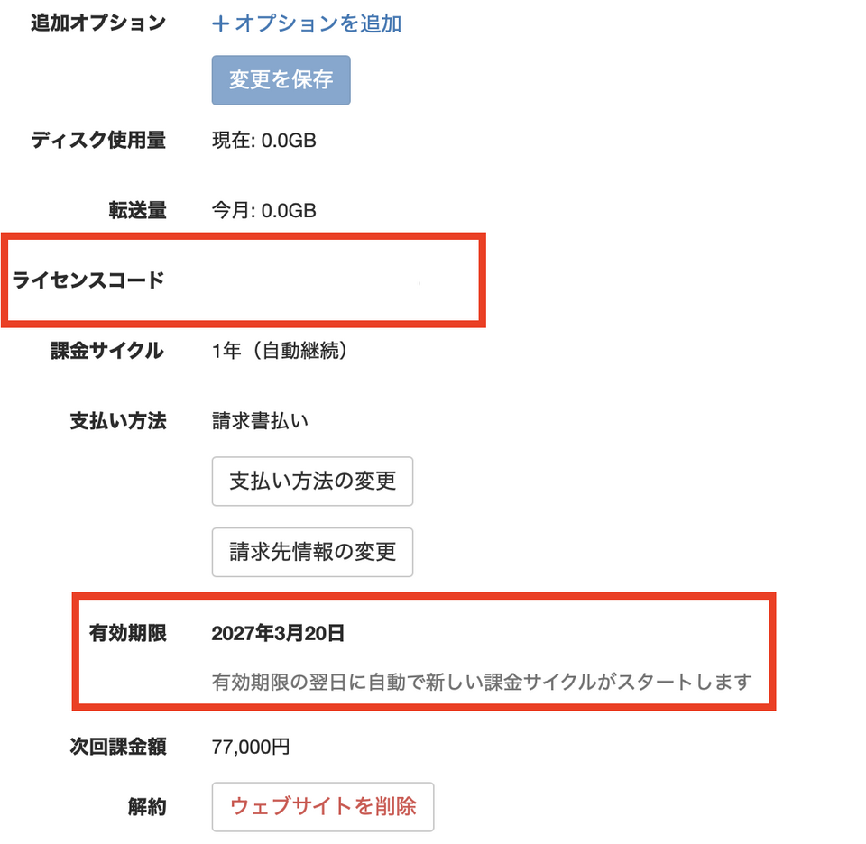 登録が完了すると、「ライセンスコード」と「有効期限」が表示されます。