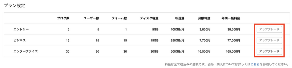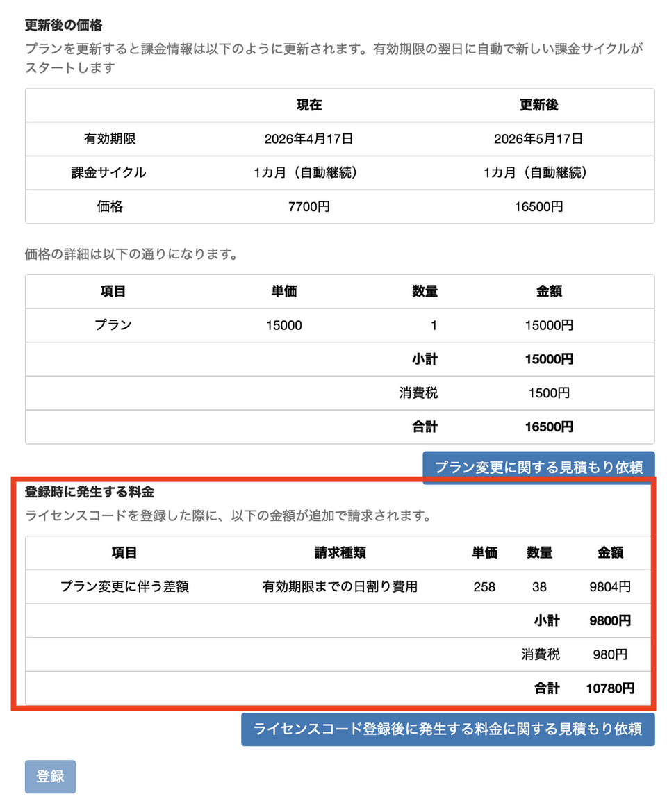 プランをアップグレード、もしくは、ダウングレードする場合、プラン変更に伴う差額が有効期限までの日割り費用で請求されます。