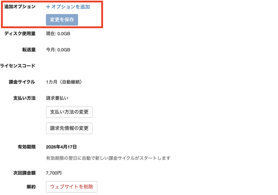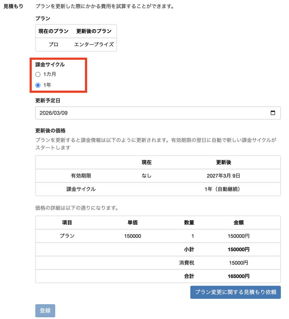 管理画面より、課金やオプション追加の際にかかる費用を試算することができます。