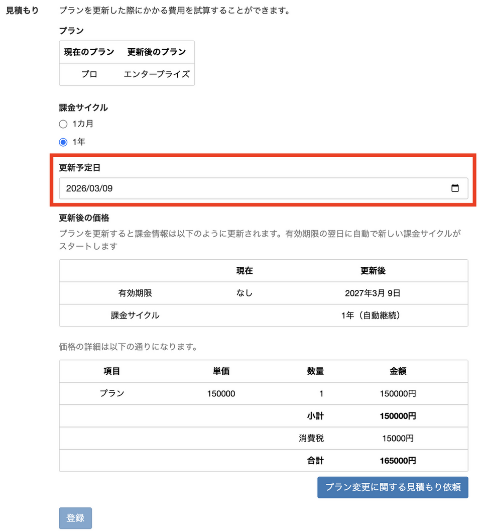 - 「更新予定日」でアップグレード、もしくは、ダウングレードを実施したい日を選択する