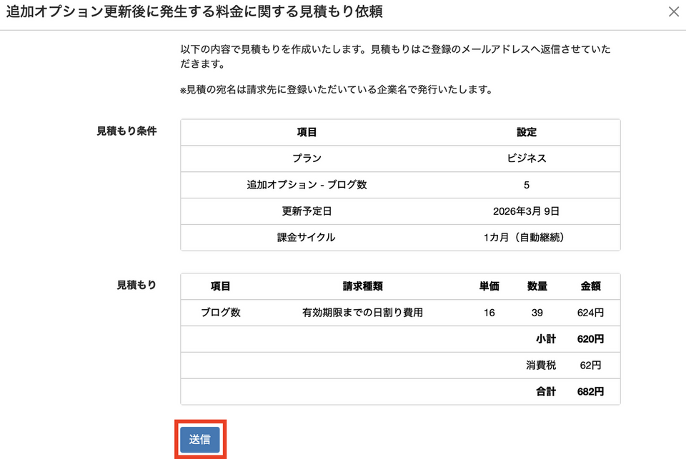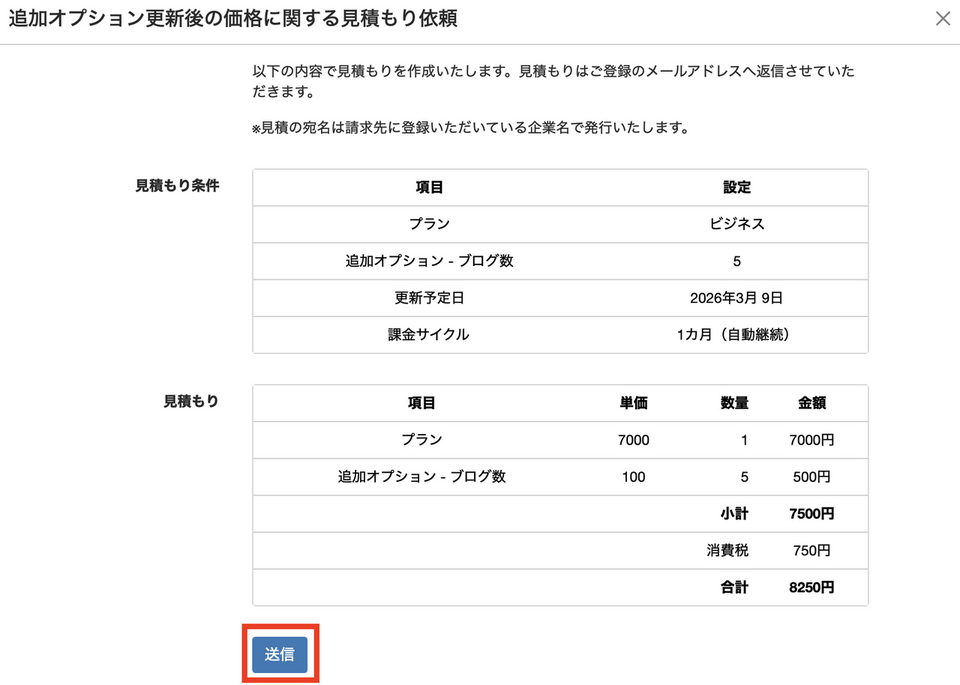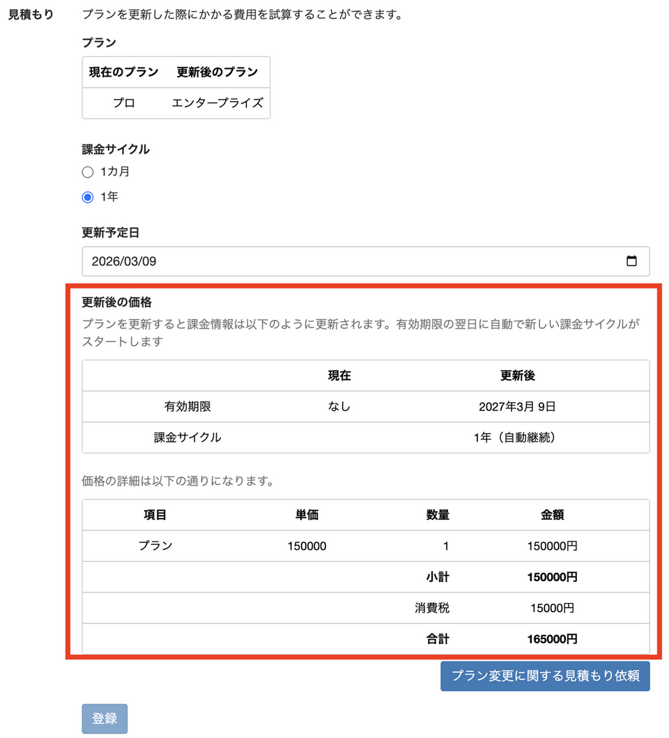 「更新後の価格」項目にて、見積もり金額が確認できます。