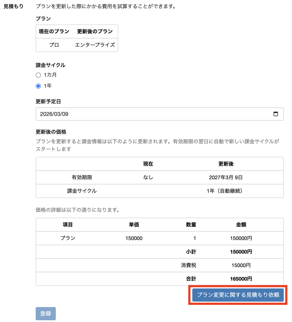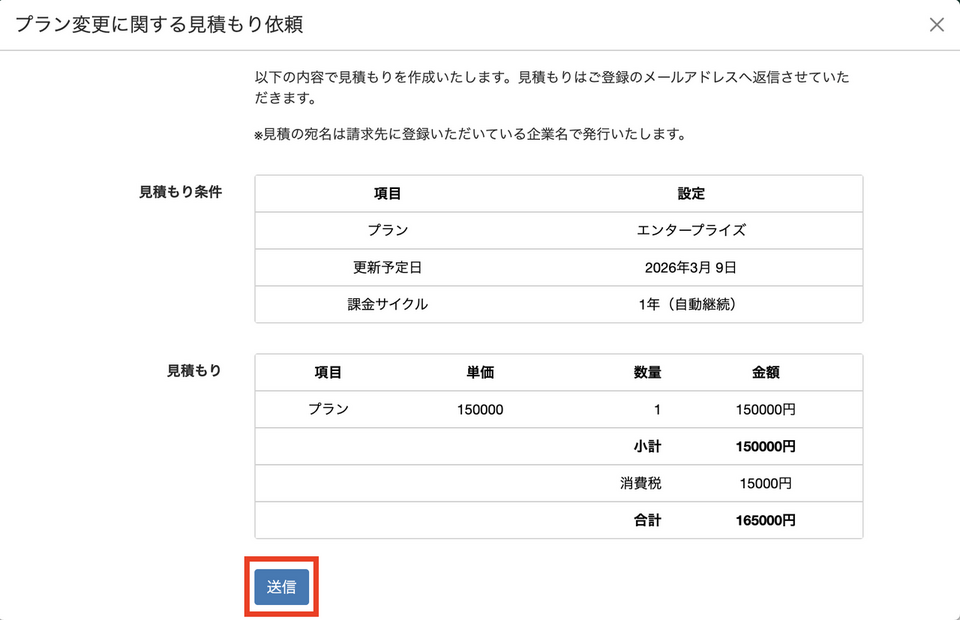 - 確認した内容と金額で見積書の発行を希望する場合は「プラン変更に関する見積もり依頼」ボタンをクリックする