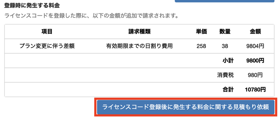 - 見積書の発行を希望する場合は「ライセンスコード登録後に発生する料金に関する見積もり依頼」ボタンをクリックする