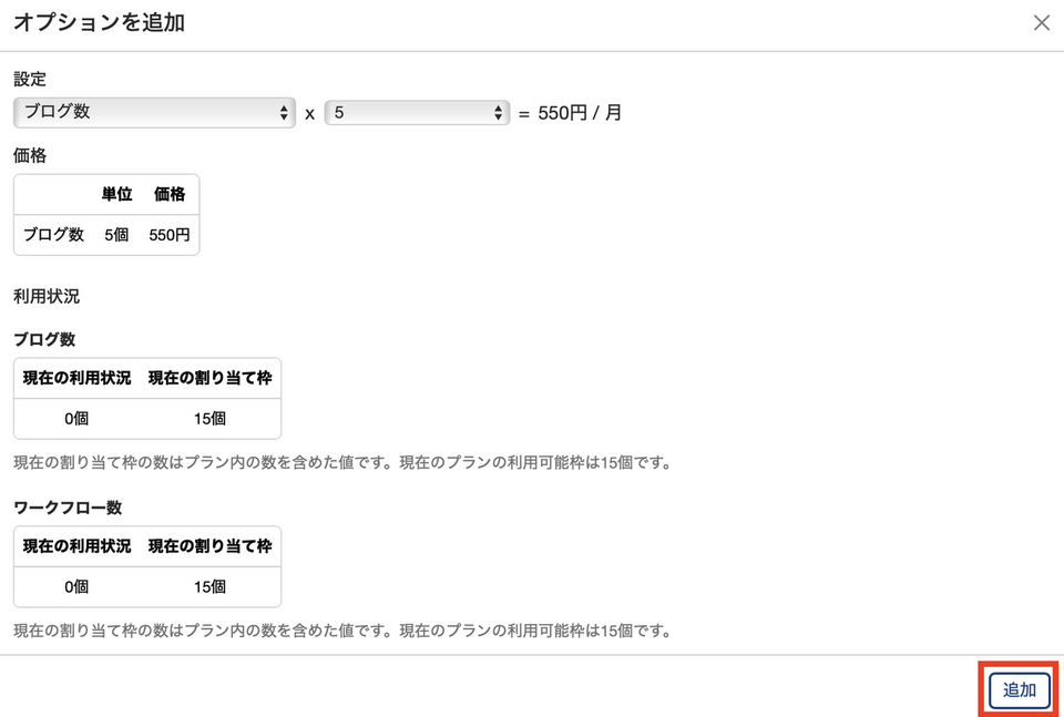 - 追加するオプションを選択後、「追加」ボタンをクリックする