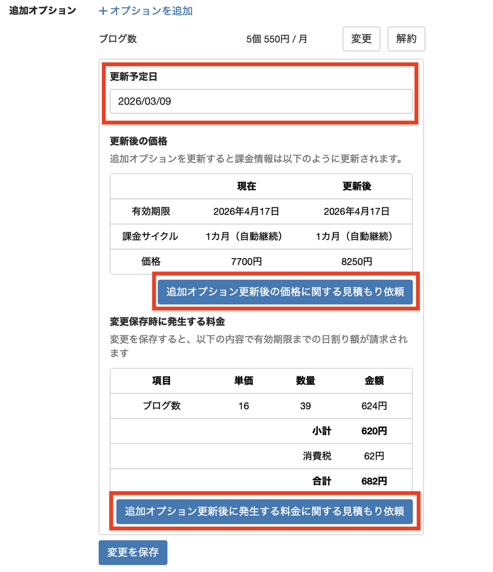 - オプション購入を予定している日を「更新予定日」から選択し、「追加オプション更新後の価格に関する見積もり依頼」、「追加オプション更新後に発生する料金に関する見積もり依頼」ボタンをクリックする
