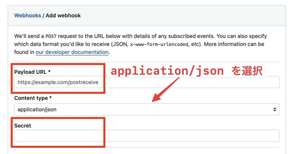 - 「Payload URL」項目と「Secret」項目にメモした内容を入力、「Content type」で「application/json」を選択し、 [Add webhook] ボタンをクリックする