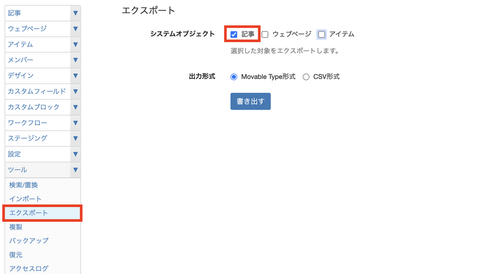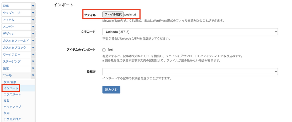 記事の投稿者を一括変更する データの書き換えを行うことで、記事の投稿者を1つずつ編集画面から変えることなく一括で変更できます。 左サイドバー [ツール] - [エクスポート] から記事のデータをエクスポートする テキストエディタなどのツールで、「AUTHOR BASENAME: 」の内容を置換する 例:「AUTHOR BASENAME: USER」→「AUTHOR BASENAME: 編集者」 この際、置換後の投稿者名は、すでに登録されているユーザー名である必要があります。 左サイドバー [ツール] - [インポート] から❷で書き換えた記事データをインポートする