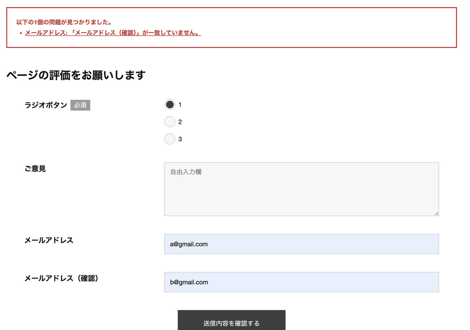 上記の設定を行うと「送信内容を確認する」ボタンをクリックした際にメールアドレスが同一かどうかのチェックを行います。